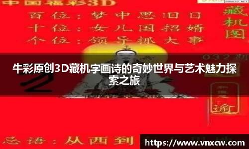 在当今快速发展的社会中,牛彩原创3D藏机字画诗以其独特风格迅速崭露头角,并赢得了一席之地。这一新兴形式不仅仅是一种视觉享受,更是一种思想和情感的传递。通过对日常生活、自然风光以及历史故事等题材进行深入挖掘,作品展现出的丰富内涵让观众产生共鸣。